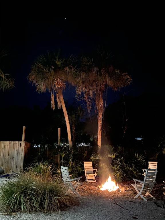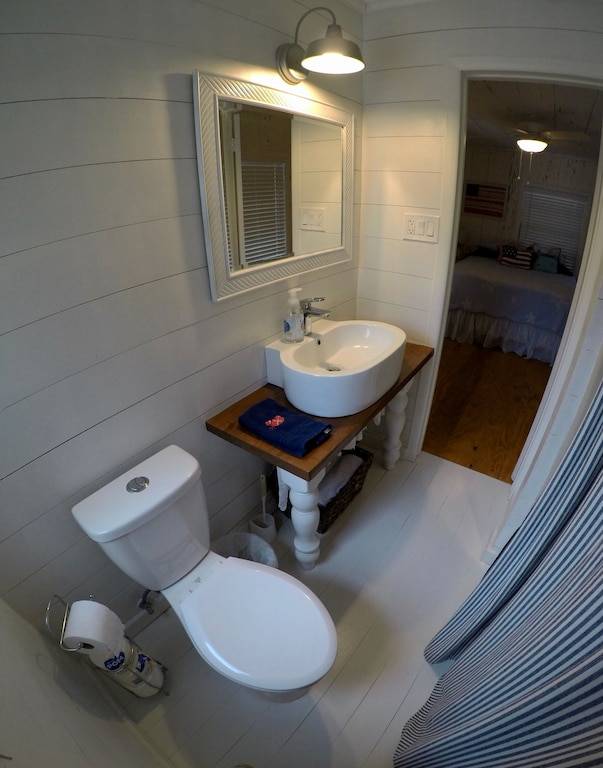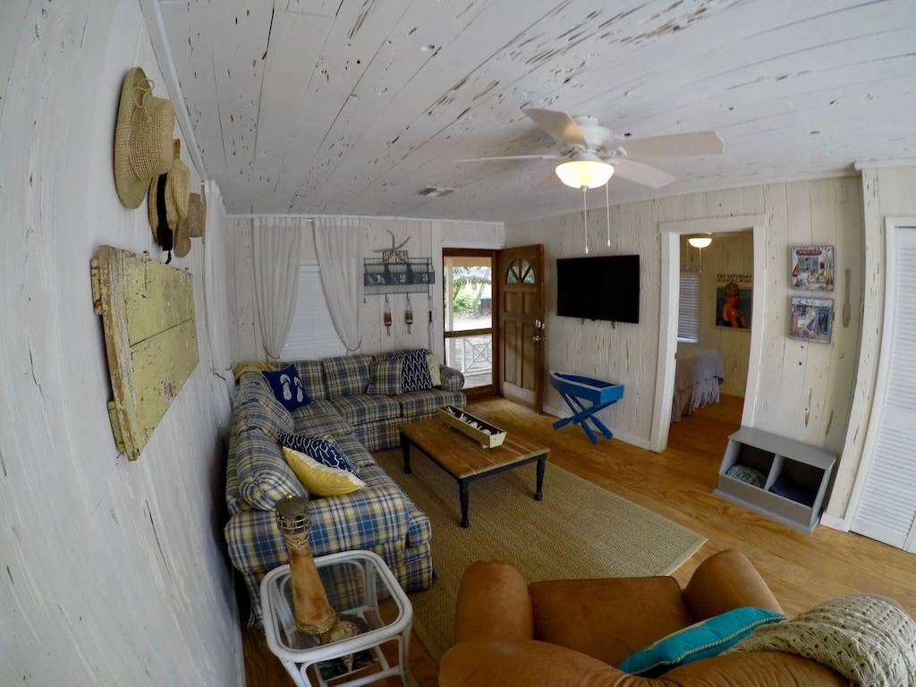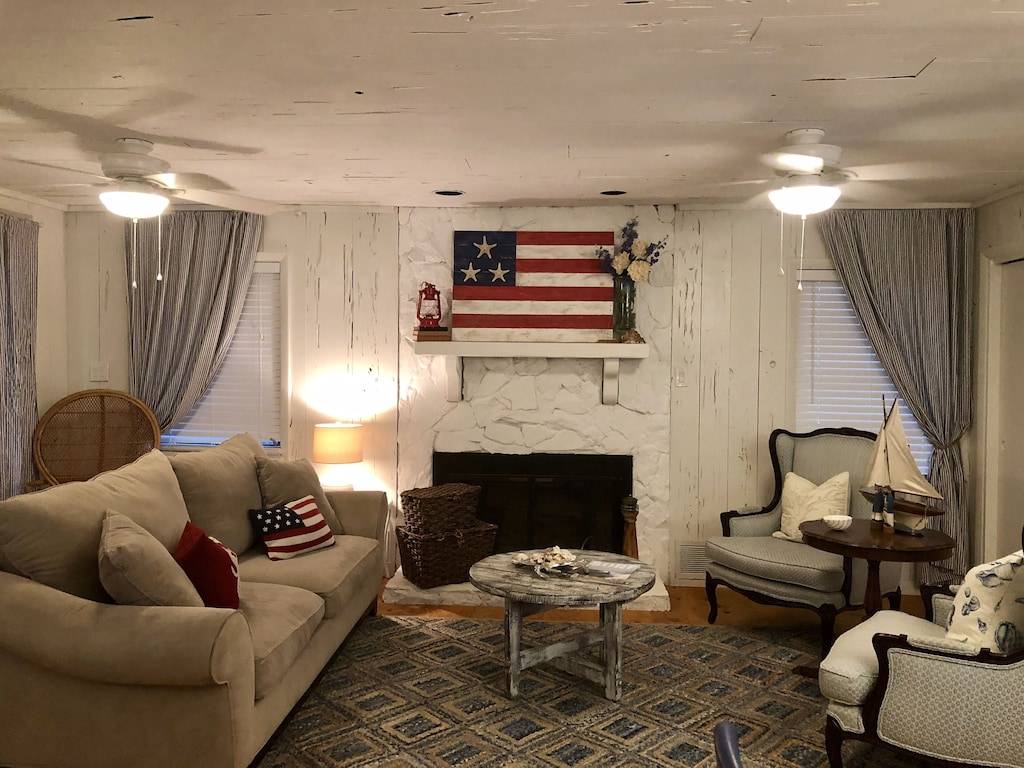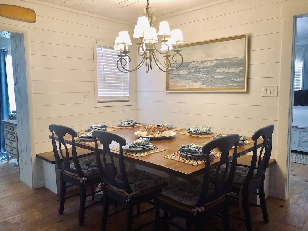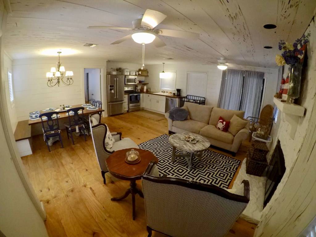 Fully remodeled, 2 bedroom 2 bath cottage with wood floors throughout and pecky cypress walls and ceilings. Outdoor living areas include 2 covered porches and a large open back deck. Large master bedroom with private bathroom, walk in closet, and a king size bed. Second bedroom features a queen size bed and private bathroom. There are two full size sofa beds located in the living room and family room. The dining room features a large, custom built-in banquette that seats up to 10 people. The new open floor plan kitchen overlooks the Family room, which includes a seating area surrounding the fireplace. Living room hosts comfortable seating around a 50” wall mounted flat screen TV. Outdoor shower.