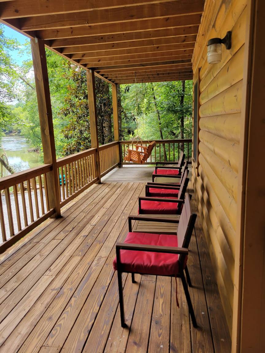 My WATERSIDE CABIN has plenty of open & covered decks furnished for relaxation in mind. Enjoy the HOT TUB, rocking chairs, porch swing, table & chairs and benches while admiring the beautiful scenic views up and down the river … BUT THERE IS MORE!